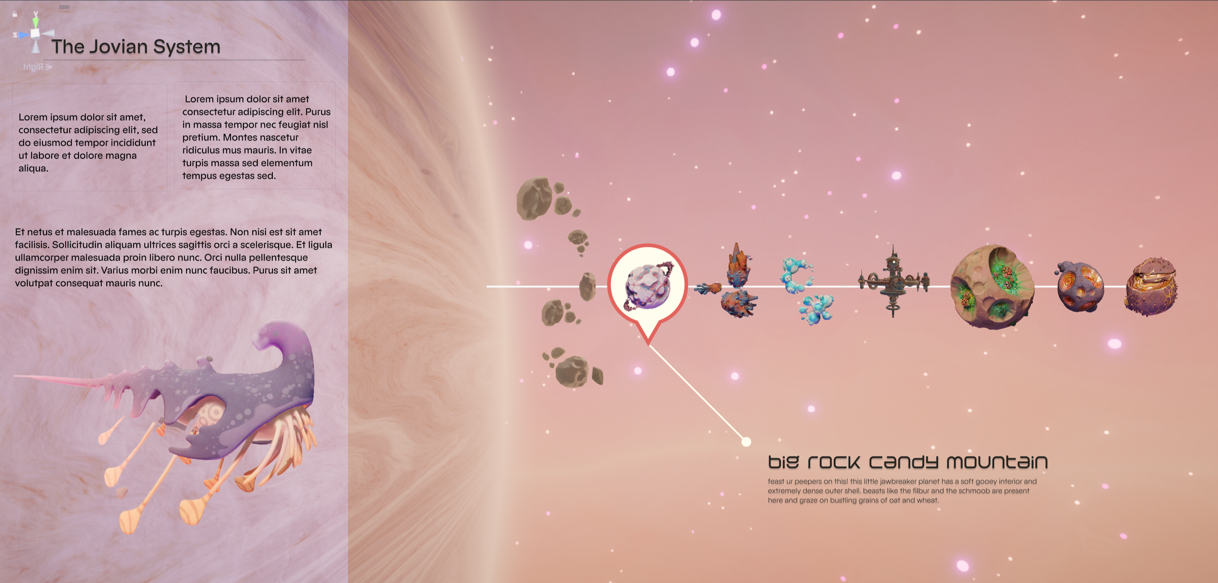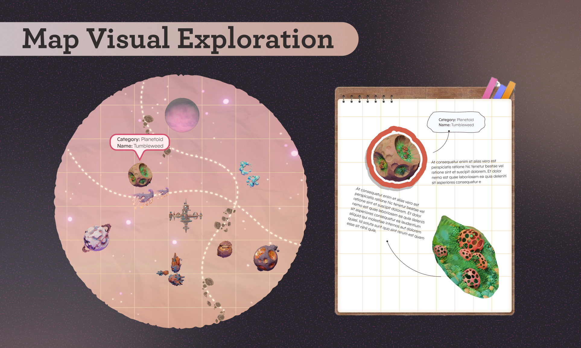 Outside of the larger brochure-style map, I wanted to explore something that felt like you were looking through a periscope or a lens. The player would have their map and upon selecting a location, they could choose a planet to read more about.